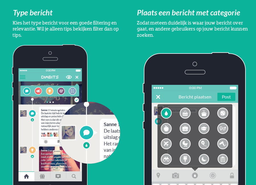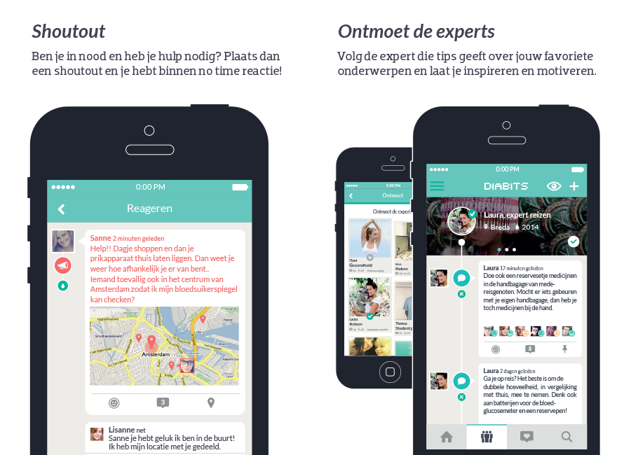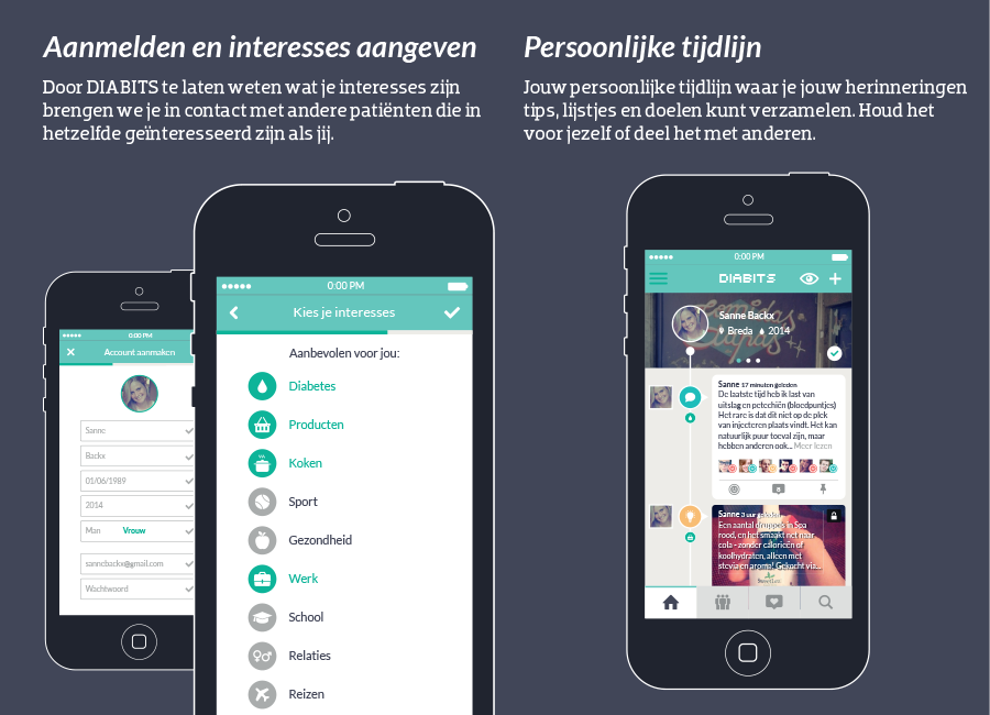 Diabits is een (sociaal) netwerk voor jongvolwassen diabetes type 1 patiënten. In de app staat peersupport centraal. Het gehele concept is gebaseerd op inspireren en motiveren. Zo brengen we patiënten samen in een vertrouwde onderling sfeer waar zij elkaar ondersteuning kunnen bieden op emotioneel en sociaal gebied.